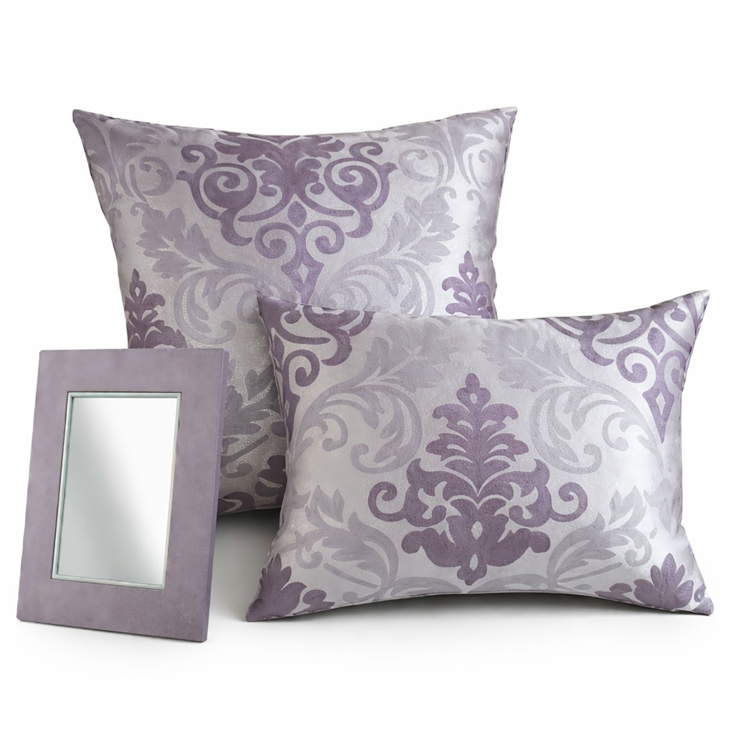 This stylish decorative cushion features a classic damask pattern inspired by traditional brocade textiles. The refined silver and lavender tones create a soft yet luxurious appearance, making the cushion ideal for modern interiors, boutique hotels, and elegant home décor collections. The silk screen printed pattern highlights the natural sheen and rich texture of authentic Thai silk, creating a beautiful visual contrast between matte and glossy elements.
