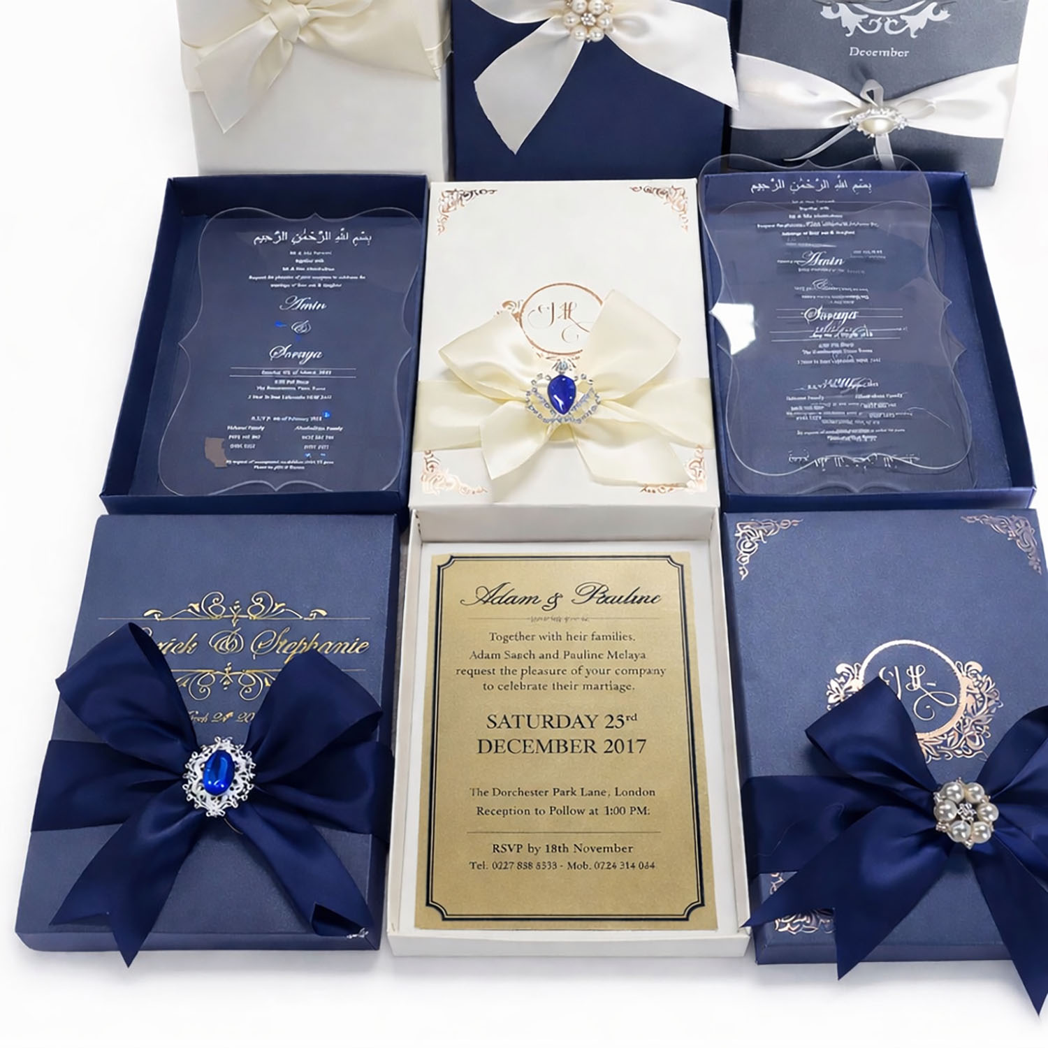 Our factory can also adjust the size of the box to perfectly fit acrylic invitations, printed cards, or additional wedding inserts. Whether you want a minimal elegant look or a more decorative luxury presentation, our team can tailor the design to your exact requirements. Featured box suits 5×7 inches invitation cards and can be ordered in custom fit as well.