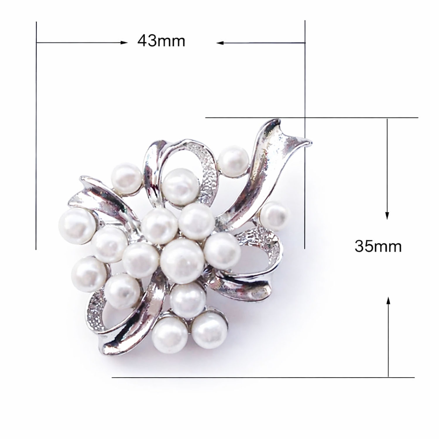 Elegant pearl and rhinestone floral brooch measuring 43x35mm, perfect for wedding invitations, favor boxes, ribbons, and luxury packaging. Ideal for DIY embellishments, wholesale supply, and custom orders from Chiang Mai, Thailand.