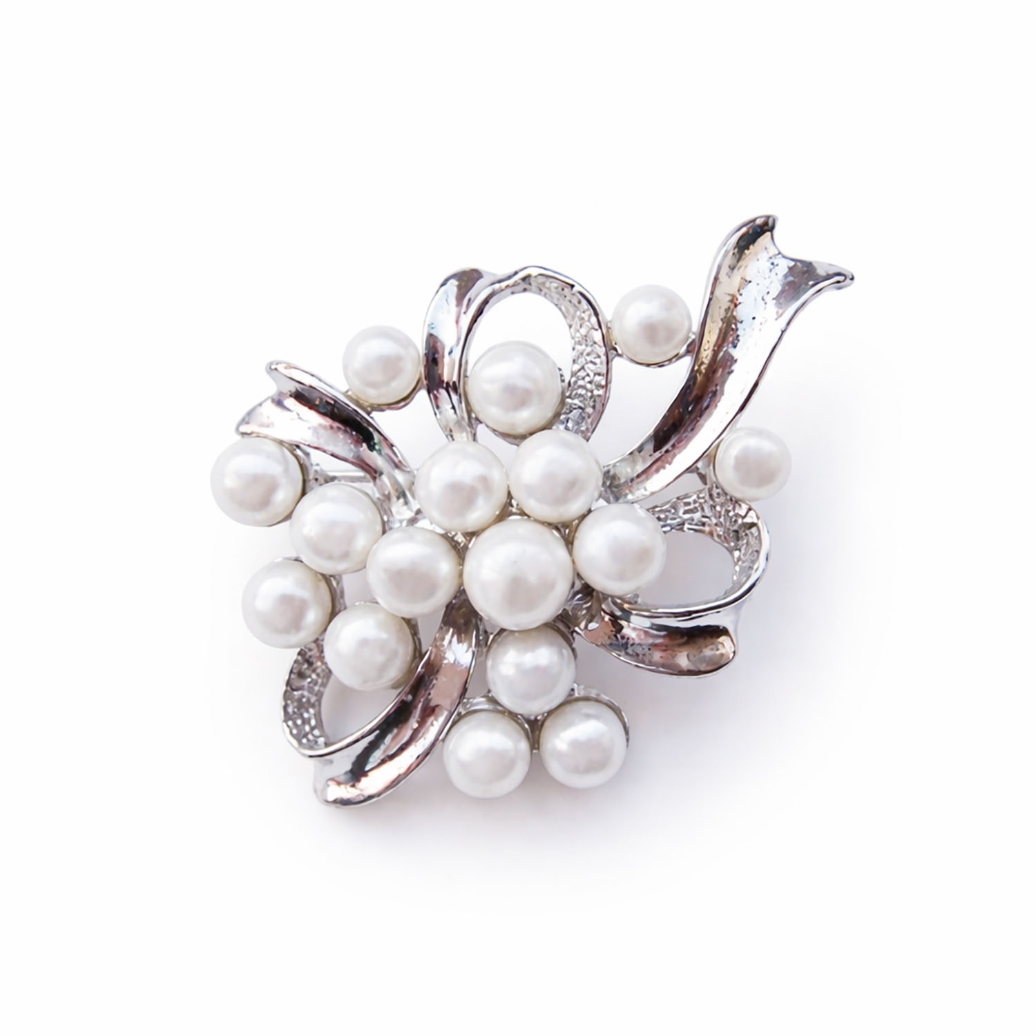 This pearl and rhinestone floral brooch showcases a delicate flower-inspired design, featuring a cluster of lustrous pearls set within a flowing silver-tone frame. The soft curves and sparkling crystal accents create a classic and sophisticated look.
