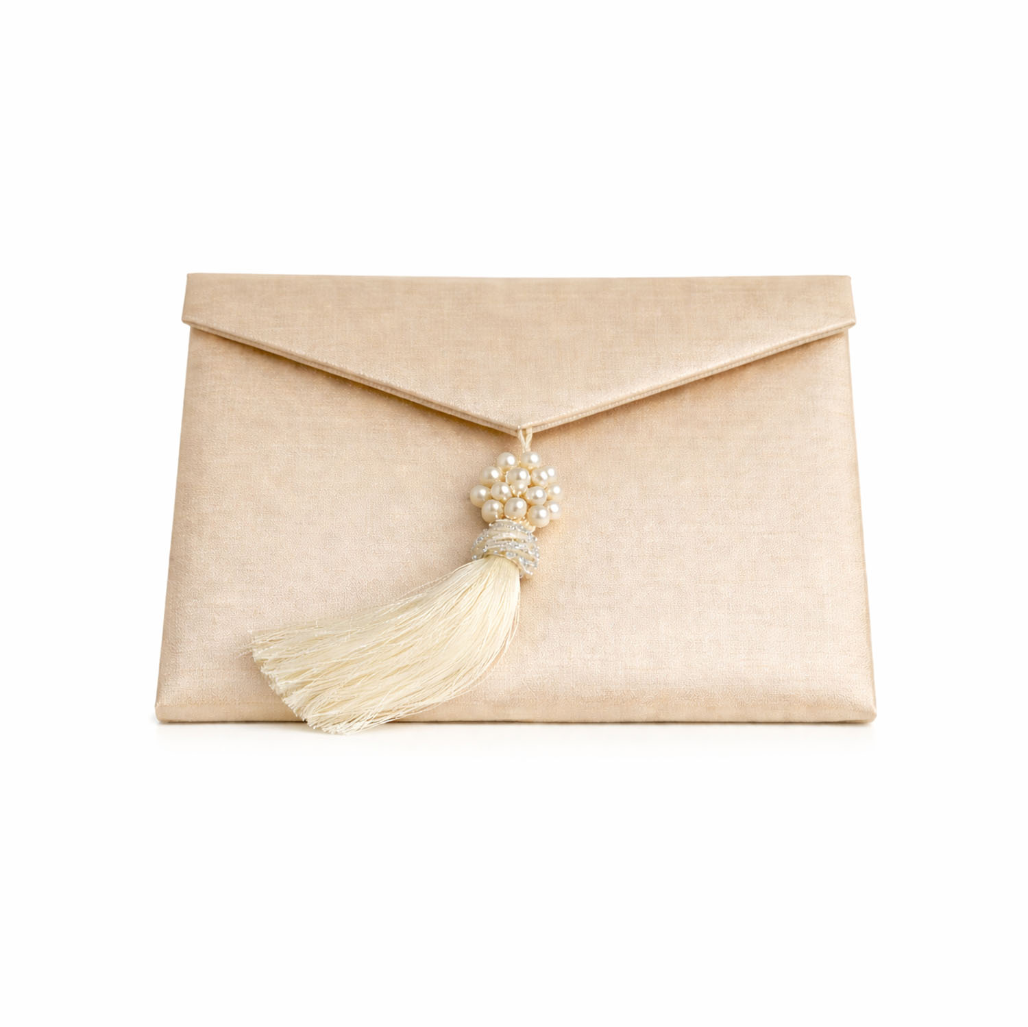 Champagne silk envelope with pearl brooch and tassel embellishment