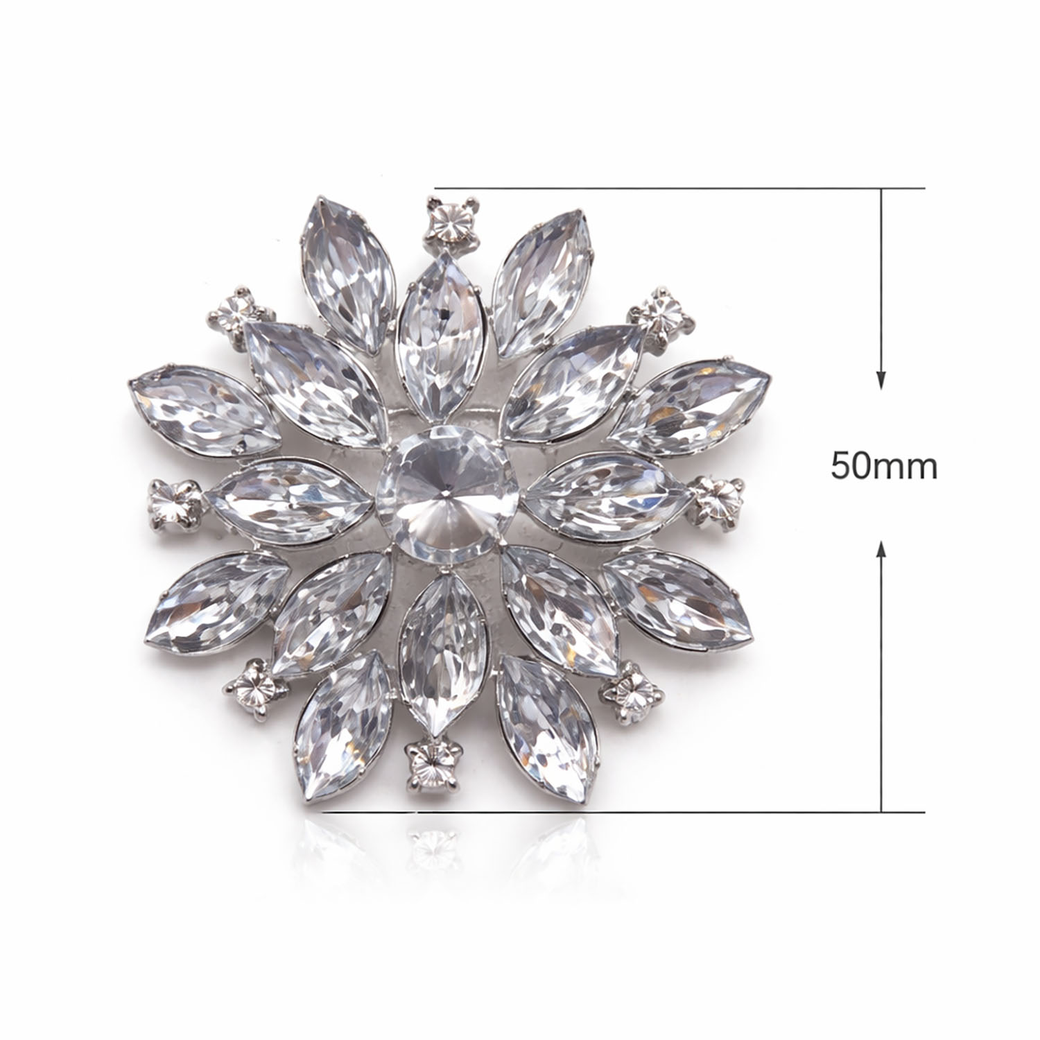 Each brooch is produced with meticulous attention to detail, using high-quality metal settings and precisely cut rhinestones to achieve exceptional brilliance. The silver plating enhances the clarity of the stones while offering a polished, long-lasting finish suitable for luxury applications.
