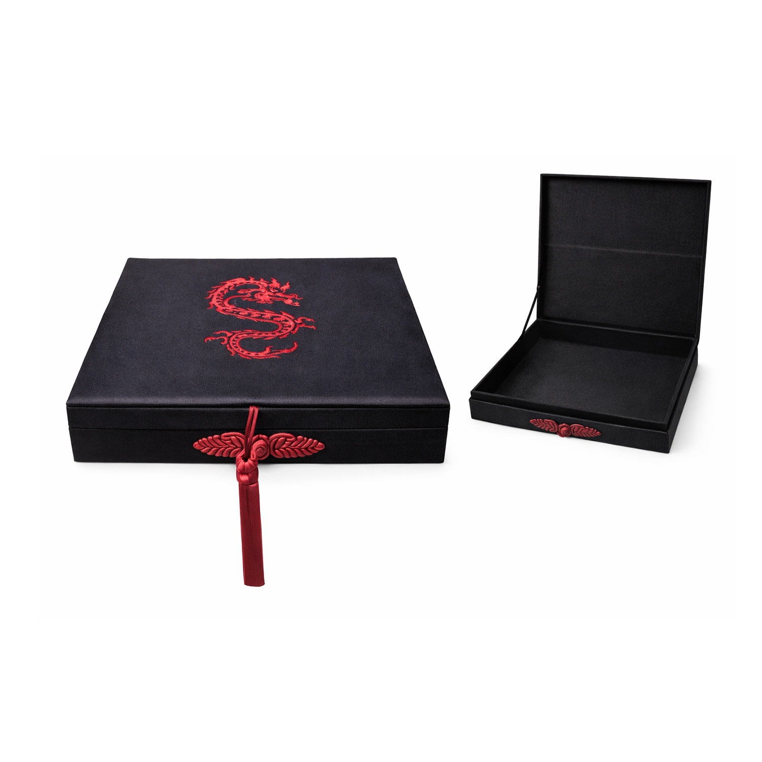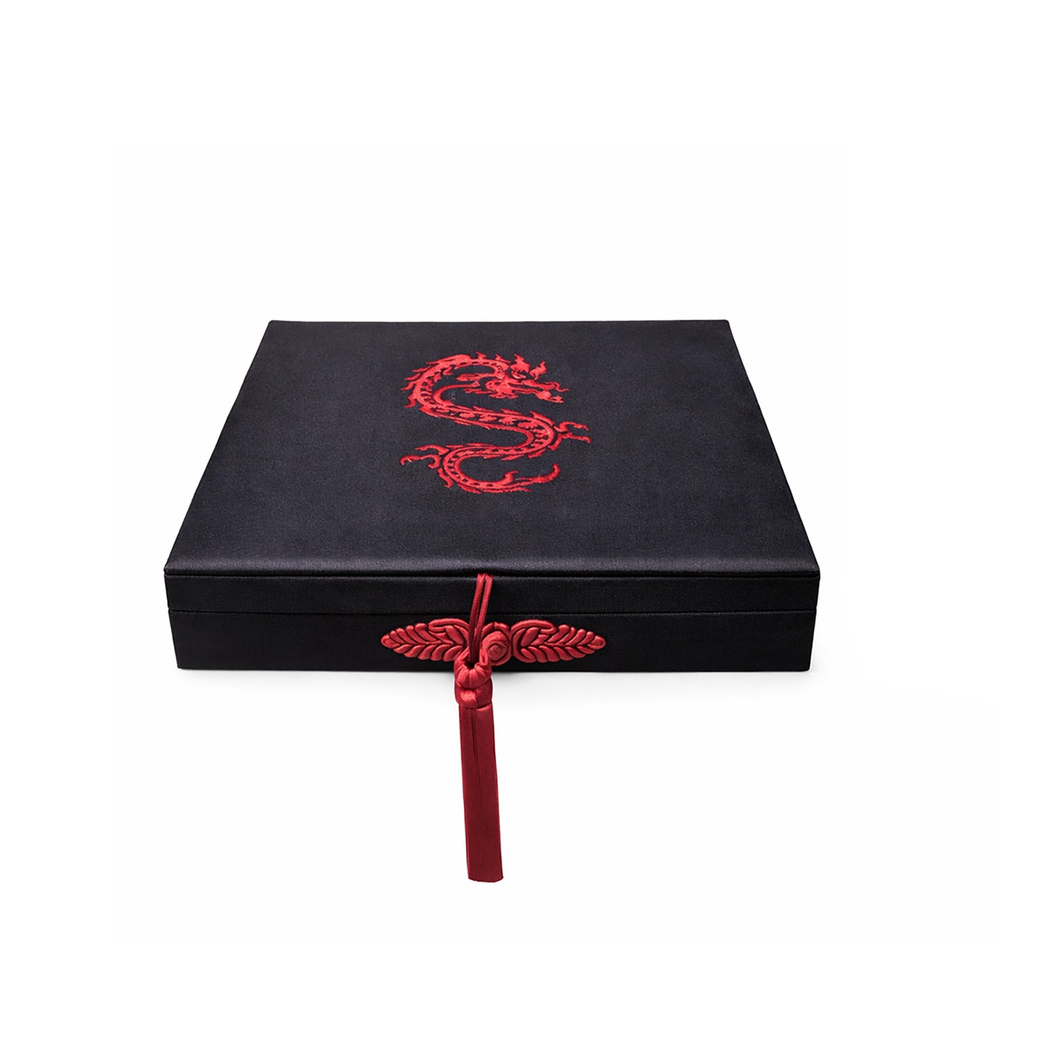 Chinese button closure with elegant handmade tassel. Dragon embroidery centered on the top lid. The box measures 6x9x1 inches and can be ordered in other sizes as well. We used black faux silk for this design with maroon tassel, closure and embroidery thread.