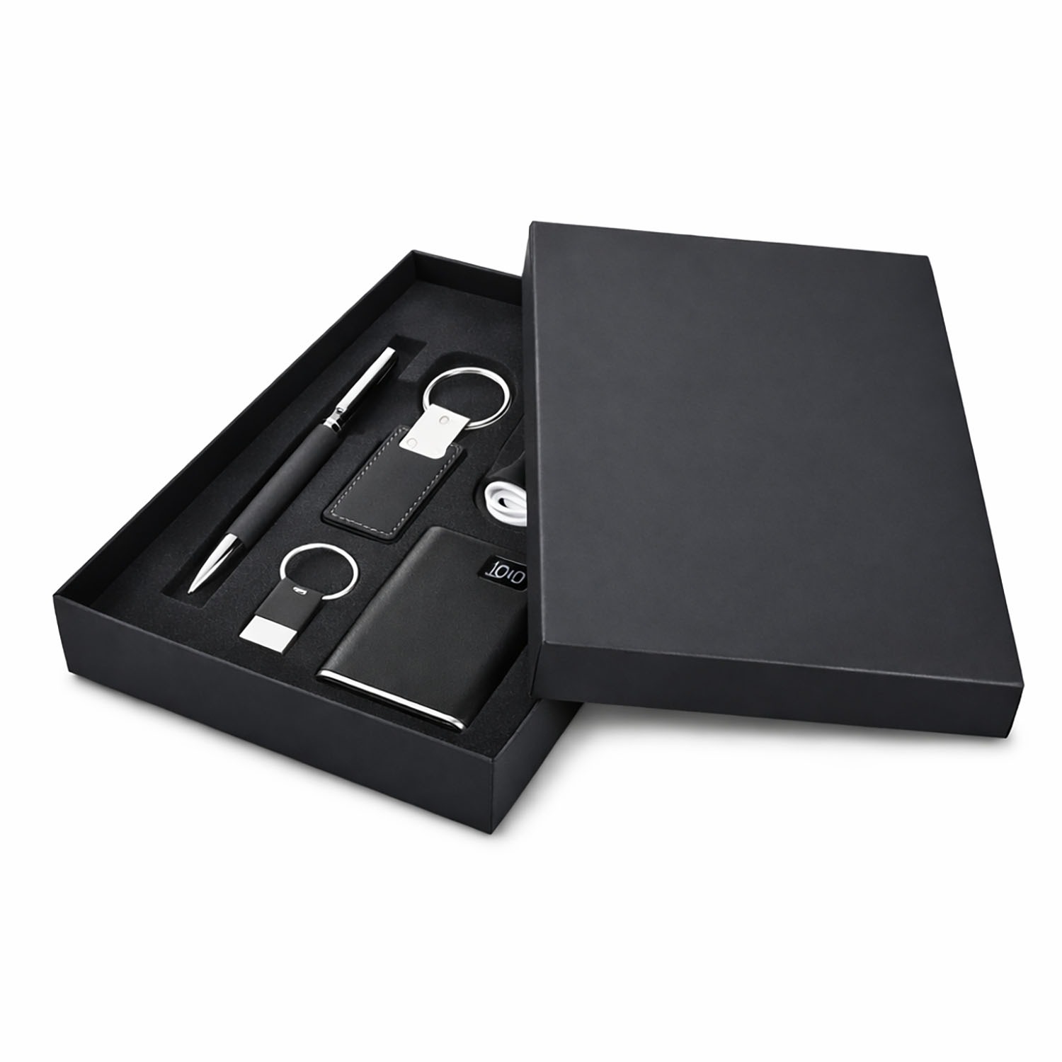 For corporate gift packaging, the box can be fitted with a custom EVA foam inlay to securely hold items such as pens, USB drives, notebooks, keychains, or technology accessories. The insert keeps each product neatly organized while adding a premium presentation.
