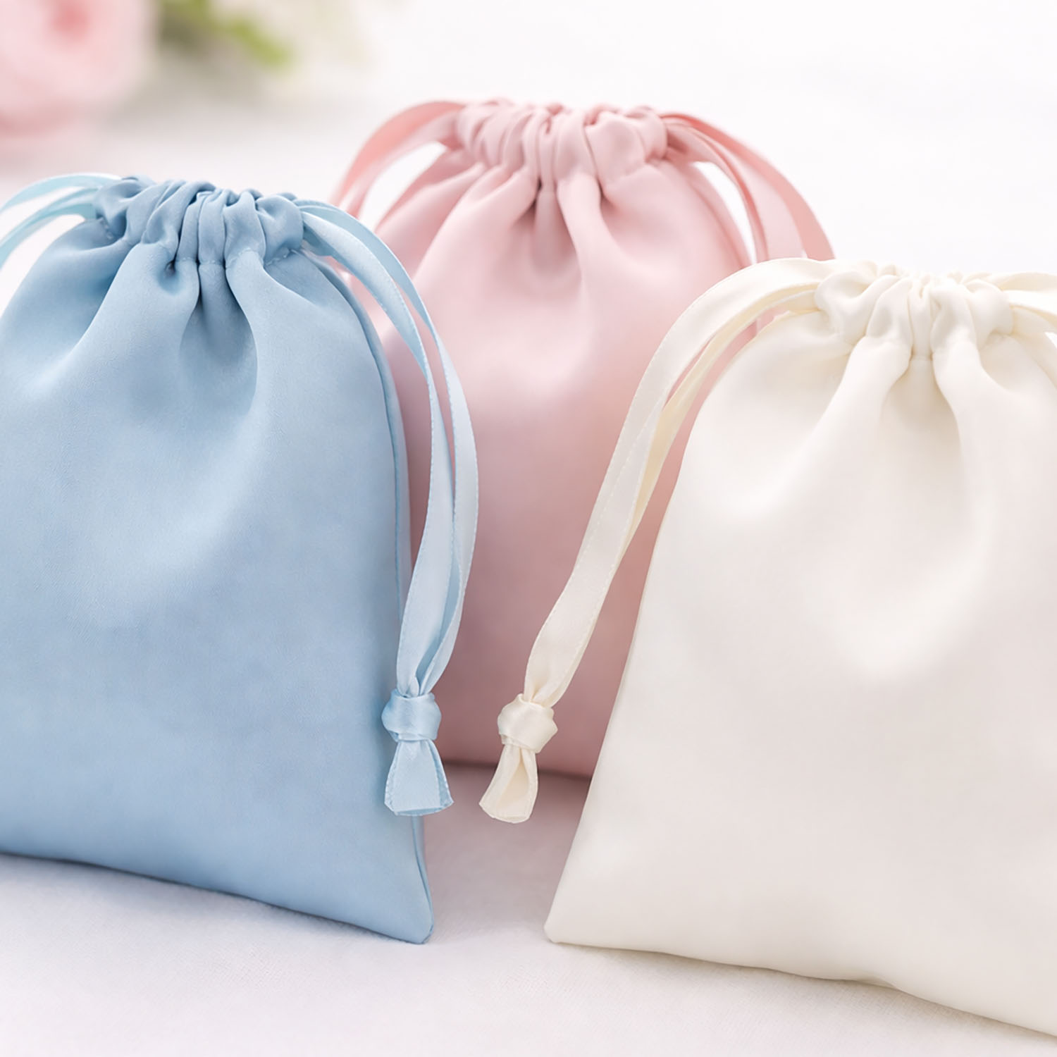 These silk bags are widely used as jewelry pouches, wedding favor bags, and luxury gift packaging. Their soft structure protects delicate items while presenting them beautifully. Many clients also use them for DIY wedding favors, allowing couples to create personalized keepsakes for guests.