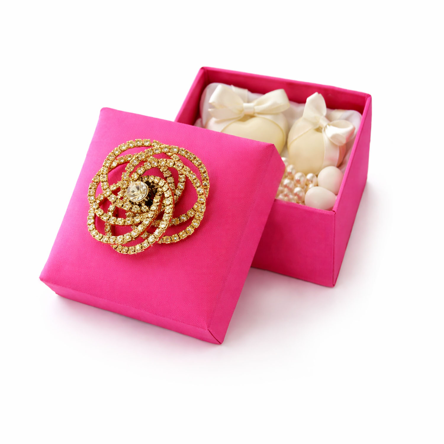 The highlight of this favor box is its stunning rhinestone brooch, carefully attached to the padded lid. Featuring a contemporary silver-plated design, the brooch adds brilliance and sophistication, transforming the box into a decorative keepsake as well as elegant packaging.